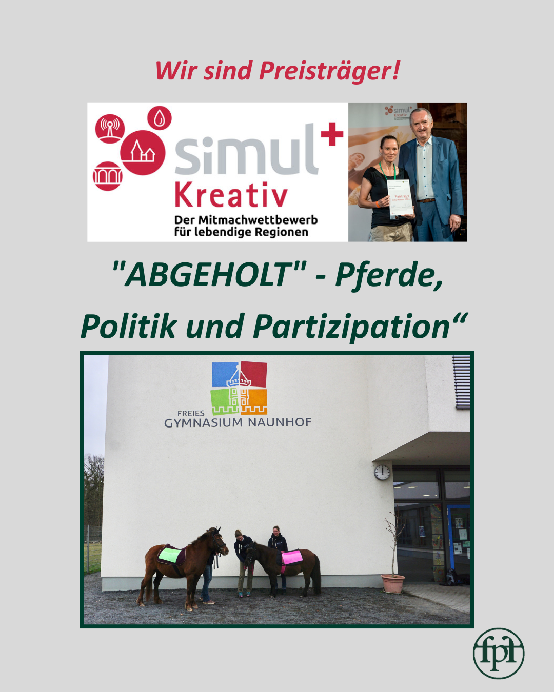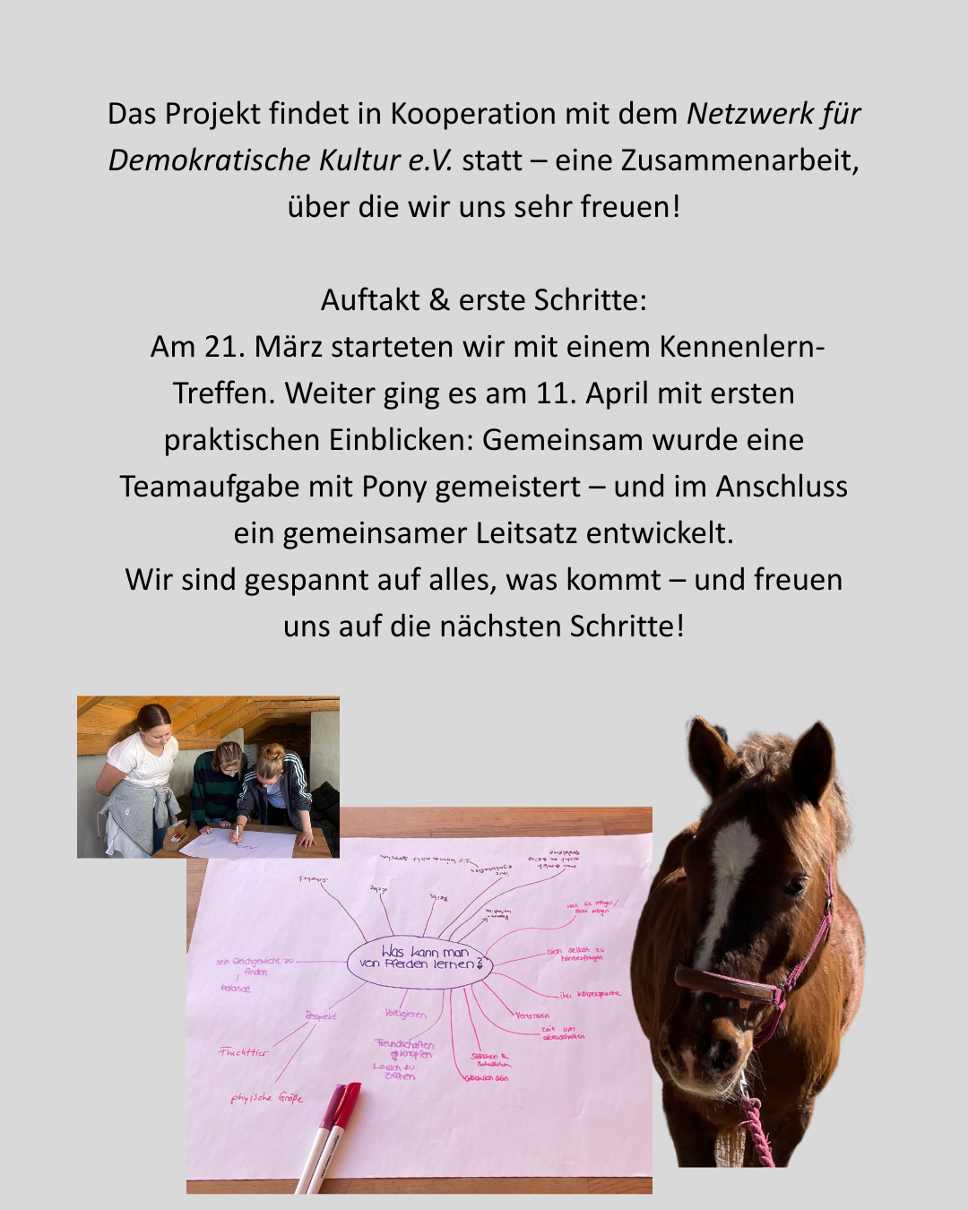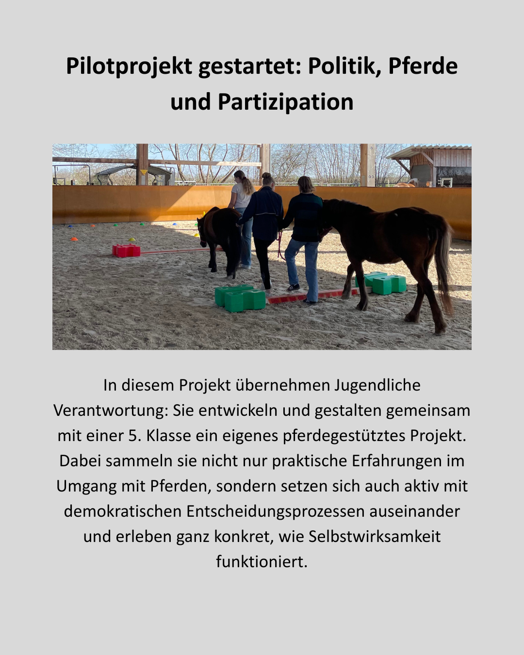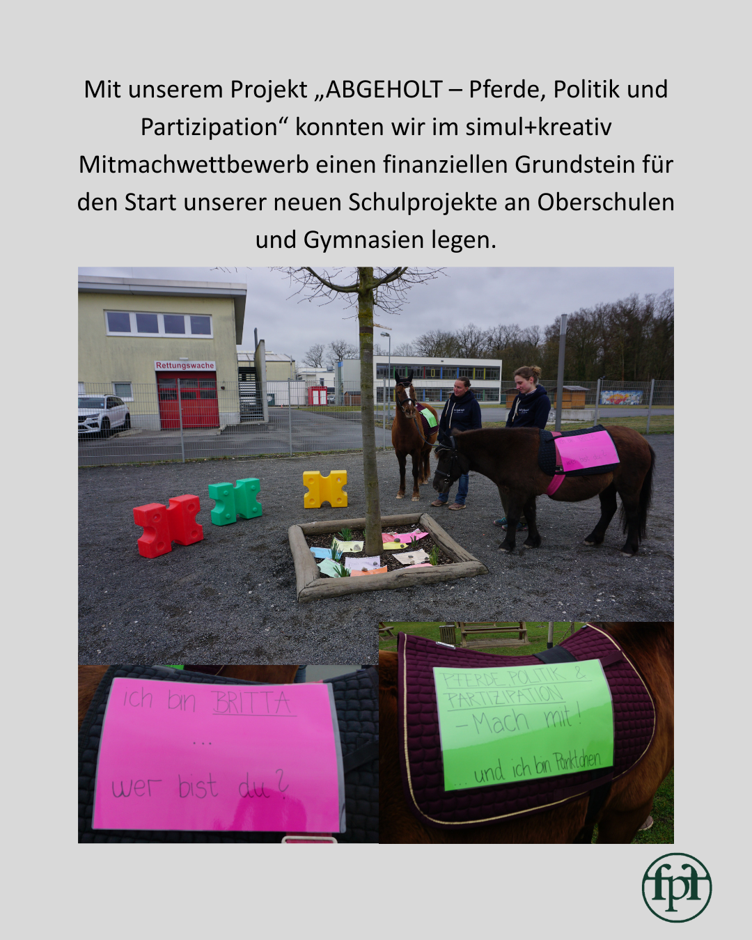 Mit unserem Projekt "ABGEHOLT" - Pferde, Politik und Partizipation“ konnten wir im diesjährigen Mitmachwettbewerb einen finanziellen Grundstein für den Start unserer neuen Schulprojekte an Oberschulen und Gymnasien legen.