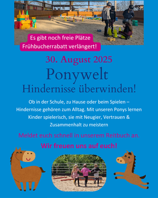 Dieses Angebot richtet sich an Kinder ab einem Alter von 5 Jahren, welche nicht an den regulären Kinderreitkursen teilnehmen oder uns zum Schnuppern besuchen möchten. Sie erleben gemeinsam in der Gruppe von maximal 12 Kindern und mit unseren Ponys eine spannende Zeit. Es gibt einen liebevoll und altersgerecht vorbereiteten Theorieteil, die Kinder putzen die Ponys und reiten gemeinsam in der Gruppe.